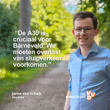 “Het is realistisch om te verwachten dat het afsluiten van de A30 zal leiden tot meer verkeer door Barneveld en omliggende dorpen,” zegt Jarne van Schaik namens de Barneveldse VVD. “We willen voorkomen dat dit zorgt voor onveilige situaties en extra druk op onze lokale wegen. Daarom vragen we het college om tijdig in overleg te gaan met Rijkswaterstaat en maatregelen te nemen om de overlast voor inwoners en ondernemers te beperken.”