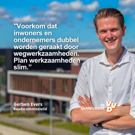 Wij verwachten dat het college goede afstemming heeft met Het Rijk en buurgemeenten én dat zij in de planning van gemeentelijke wegwerkzaamheden hiermee rekening houden - ook met de aanpak van de A30. We moeten voorkomen dat inwoners en ondernemers dubbel geraakt worden door wegwerkzaamheden. Het Barneveldse wegennet slibt al teveel dicht. Dus: plan onderhoud slim en voorkom verdere overlast.